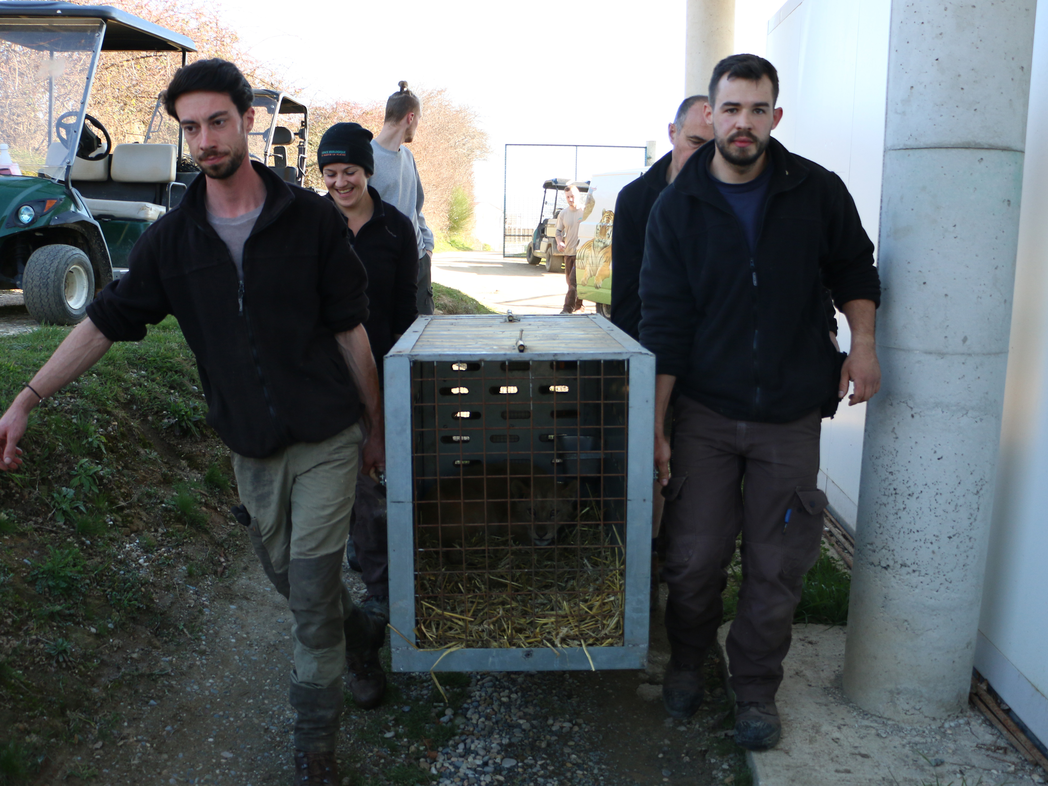Les lions sont arrivés dans leur remorque ce lundi 28 février mais le camion trop imposant ne pouvant être acheminé directement sur le site de l’association, la remorque s’est arrêtée au parking de l’Espace Zoologique. Les lions adultes ont été anesthésiés et ont été transférés dans les bâtiments de Tonga un par un. Quelques visiteurs surpris ont pu assister à ce transfert particulier à travers le parc. Ils ont pris place dans notre 4ème bâtiment, où logeaient il y a tout juste 3 semaines, Angela, Bellone, Saïda et Louga, envoyés dans un sanctuaire en Afrique du Sud.
