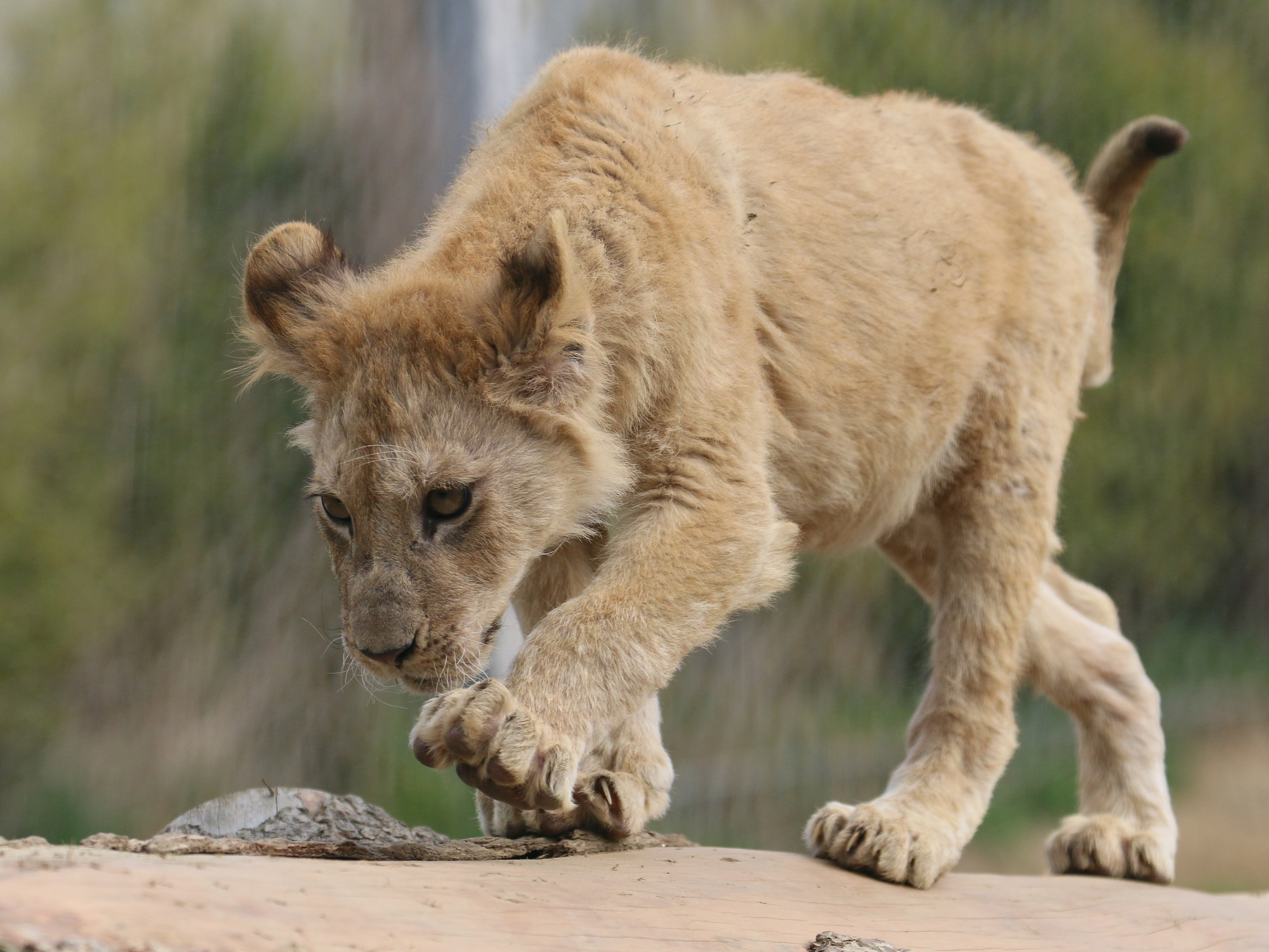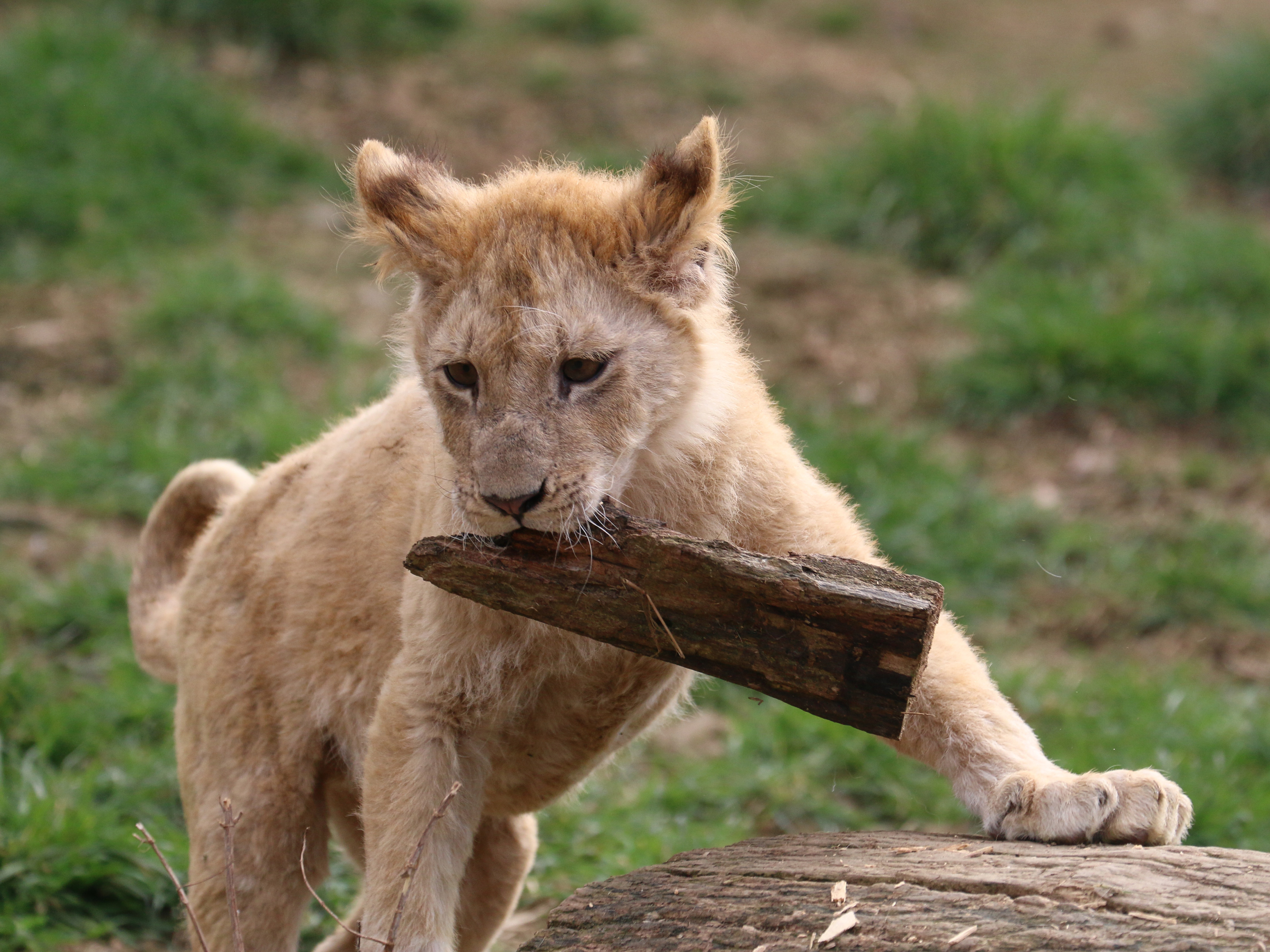 Après avoir pris connaissance de leurs intérieurs, ils ont découvert pour la première fois l'herbe sous leurs pattes. Ils ont très vite été à l'aise et ont parcouru leur enclos sans trop se soucier de notre équipe venue observer et surveiller leur sortie. Leur espace est situé à côté de celui des 10 tigres, dont le plus proche est Douglas. Tous sont très curieux de leurs nouveaux voisins. Les lionceaux comme les adultes n'hésitent pas à jouer avec des branches, des écorces ou des jeux mis à leur disposition. Des expériences toutes nouvelles pour eux !