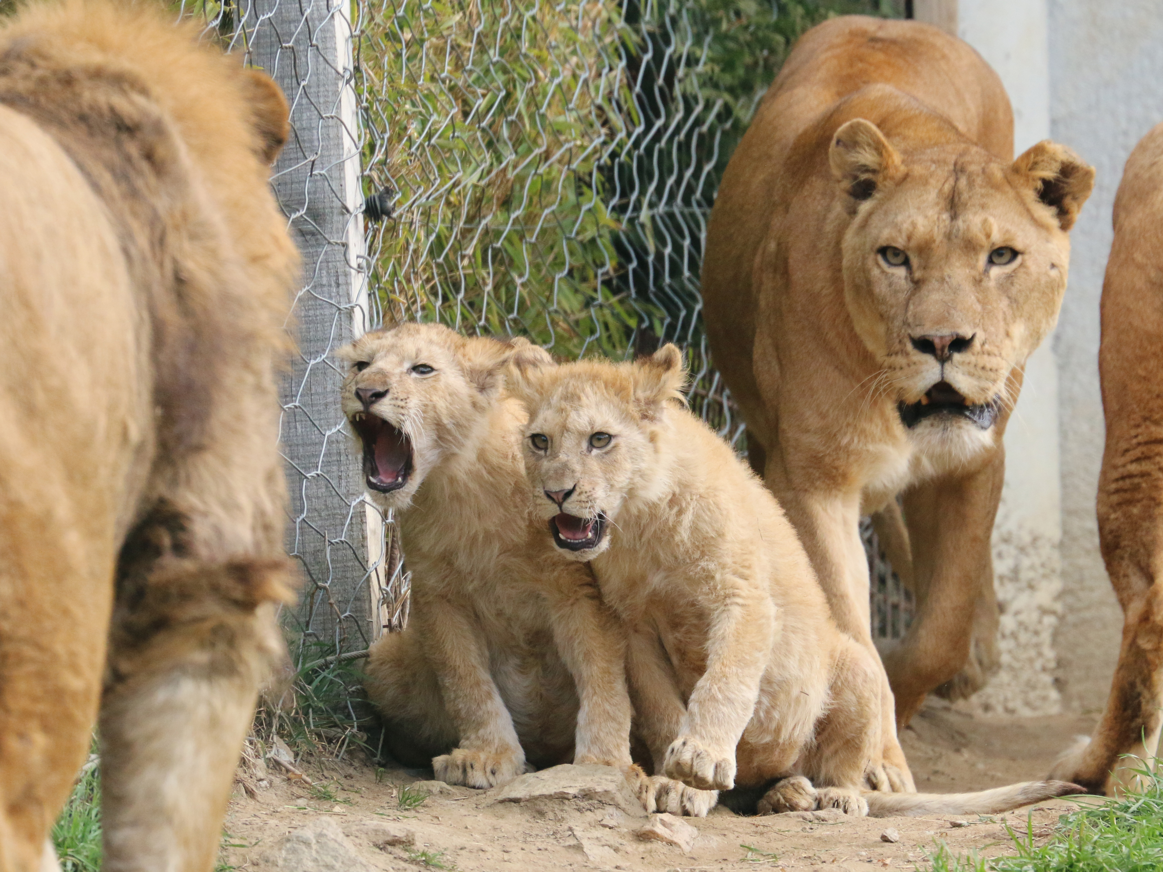 Nous vous présentons : Goliath et Coralie, le couple ; leurs enfants : Mao, mâle de 3 ans, et deux petites lionnes de 3 mois, pas encore nommées ; ainsi que Melone, la sœur de Goliath.