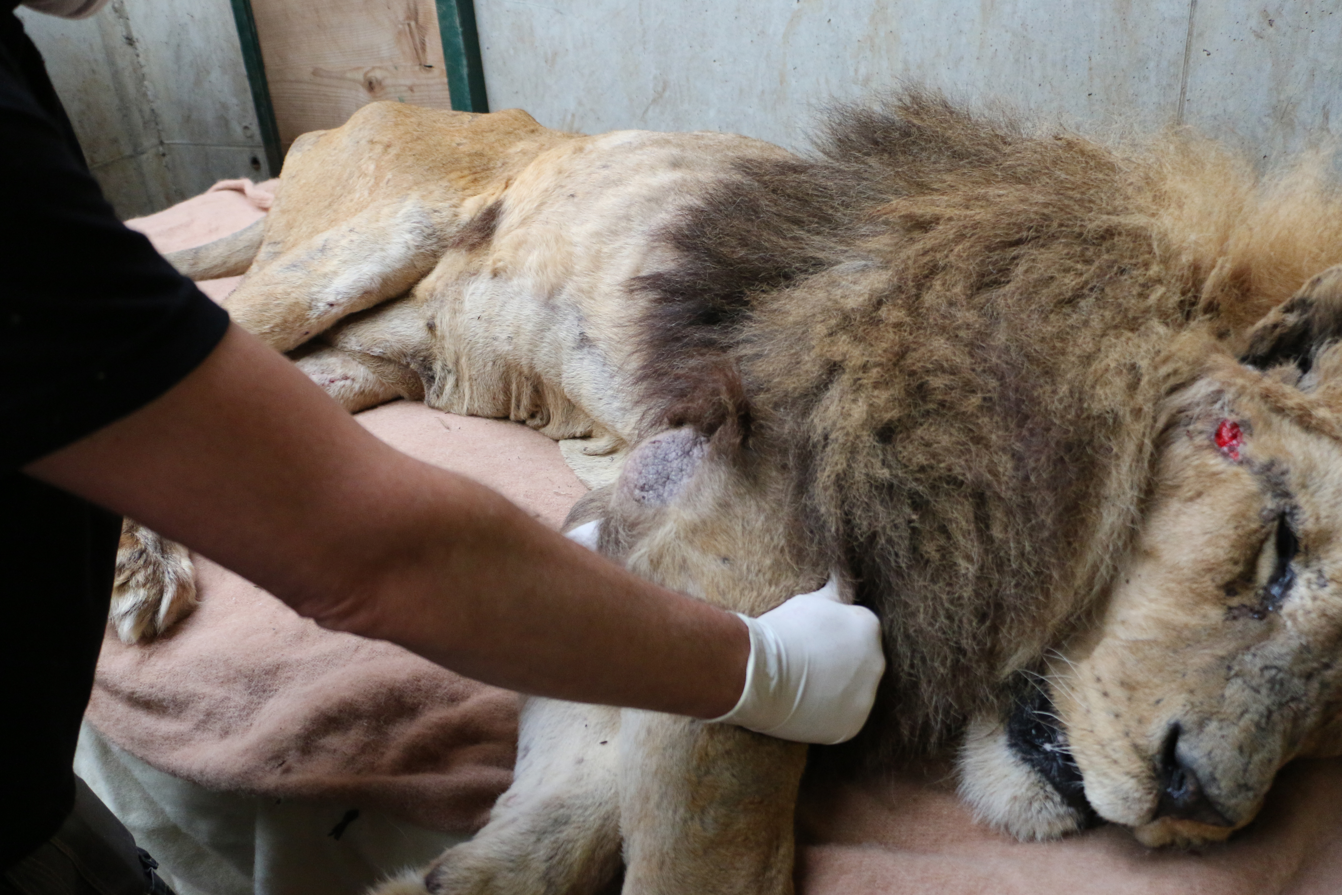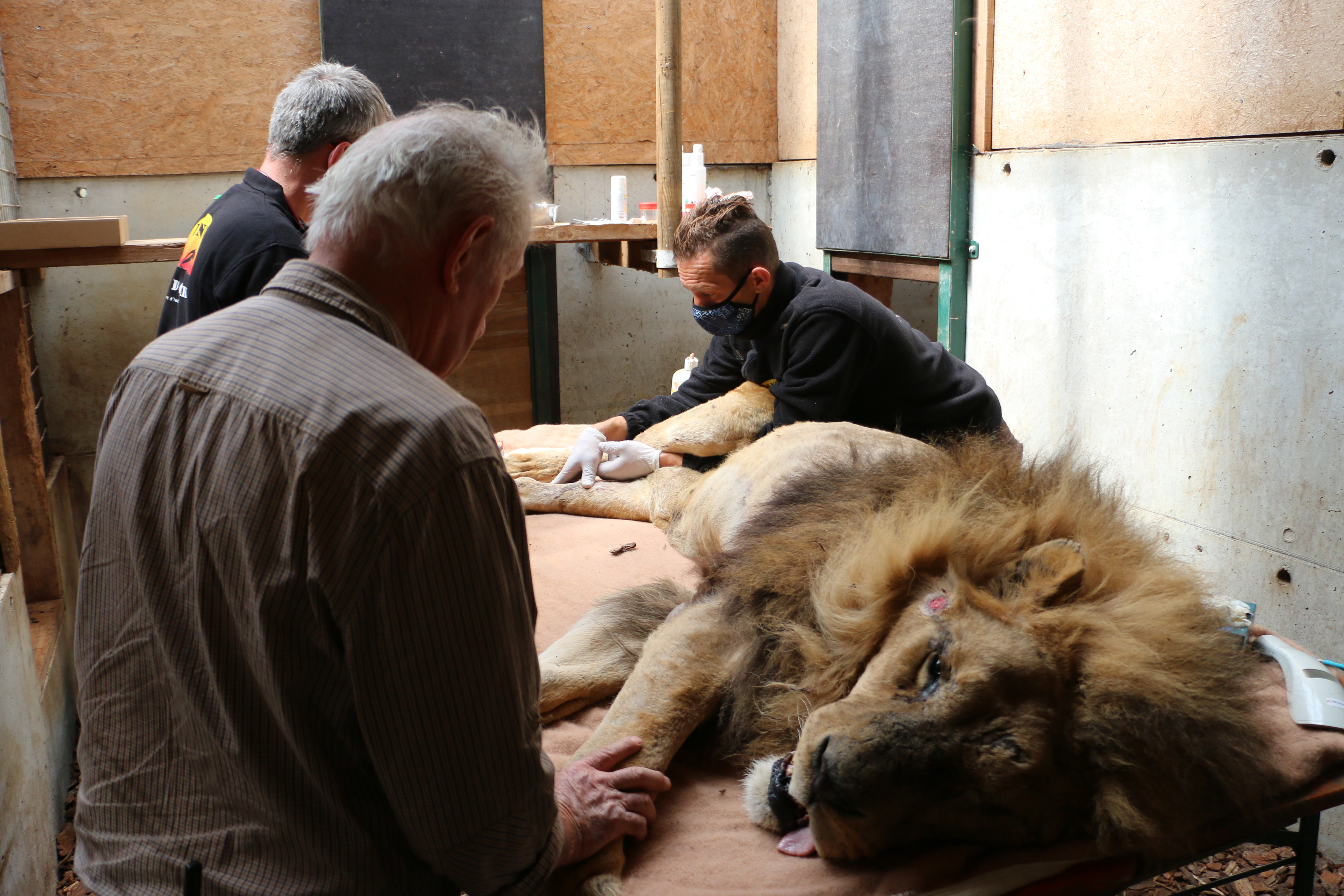 C’est hélas la seule constatation réjouissante, car son corps est encore meurtri. Il a de nombreuses marques sur l’ensemble de son corps, sur son front, ses coudes, son ventre, ses jambes... Il était impératif d’intervenir sur sa queue. L’opération a duré une heure.