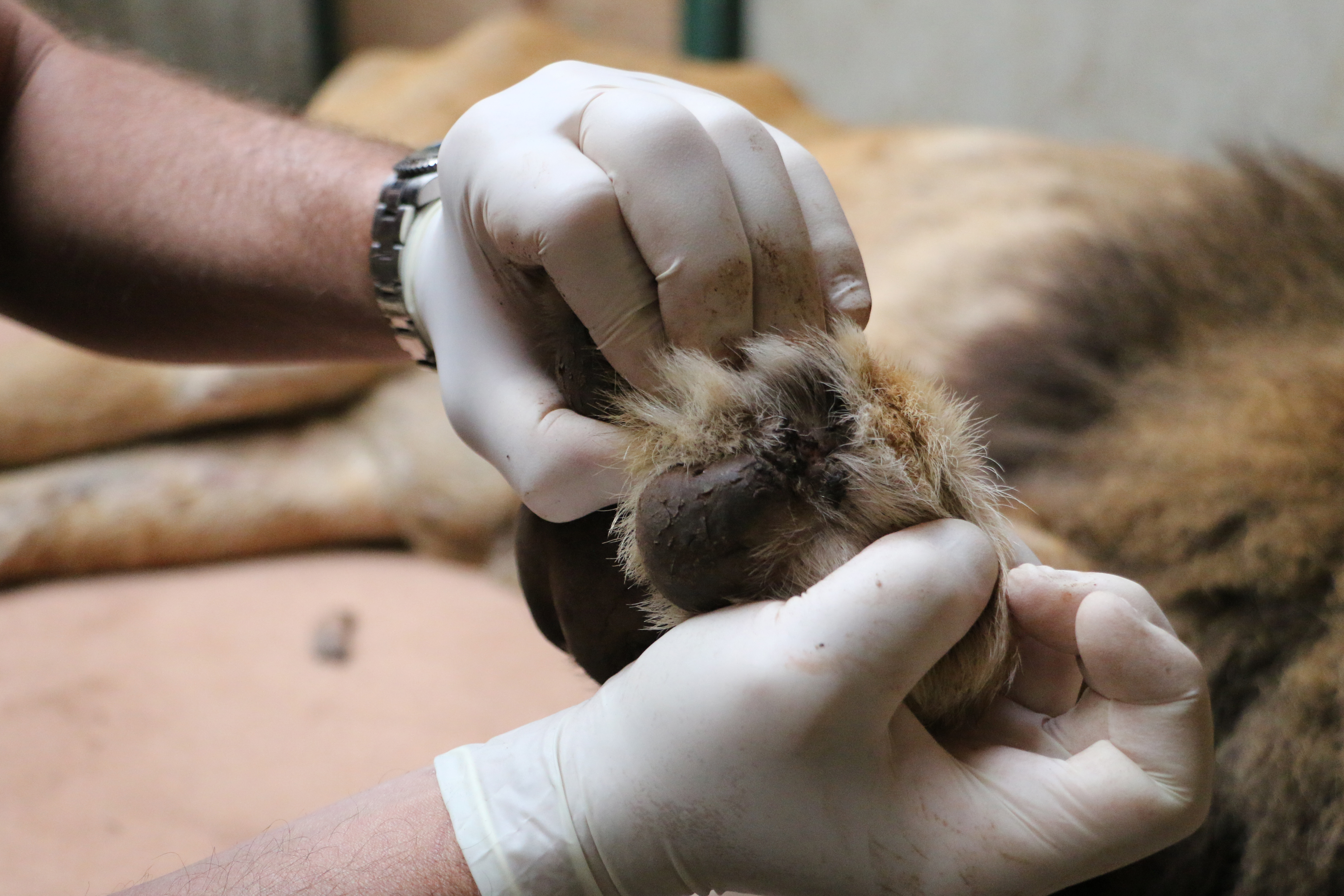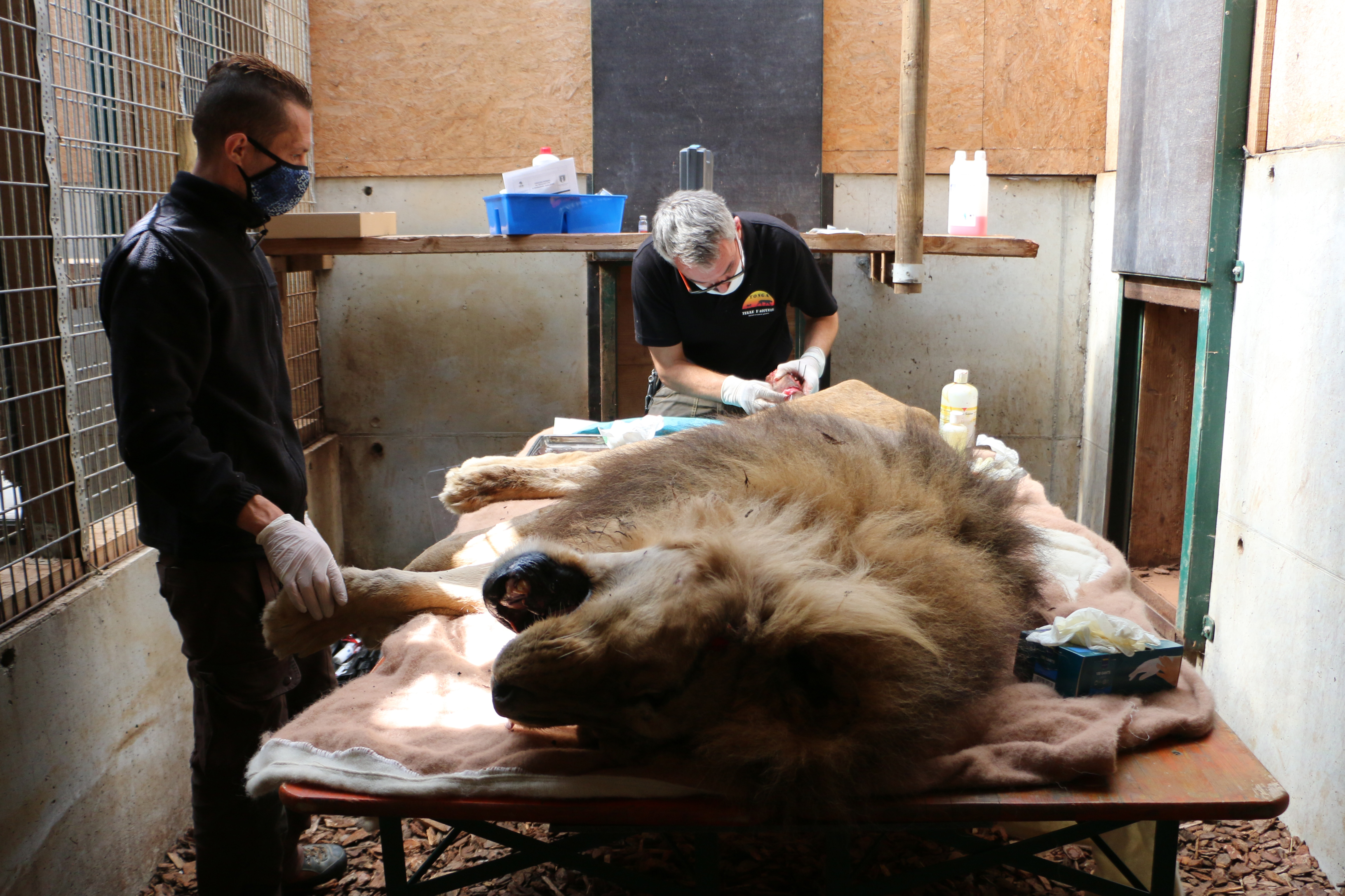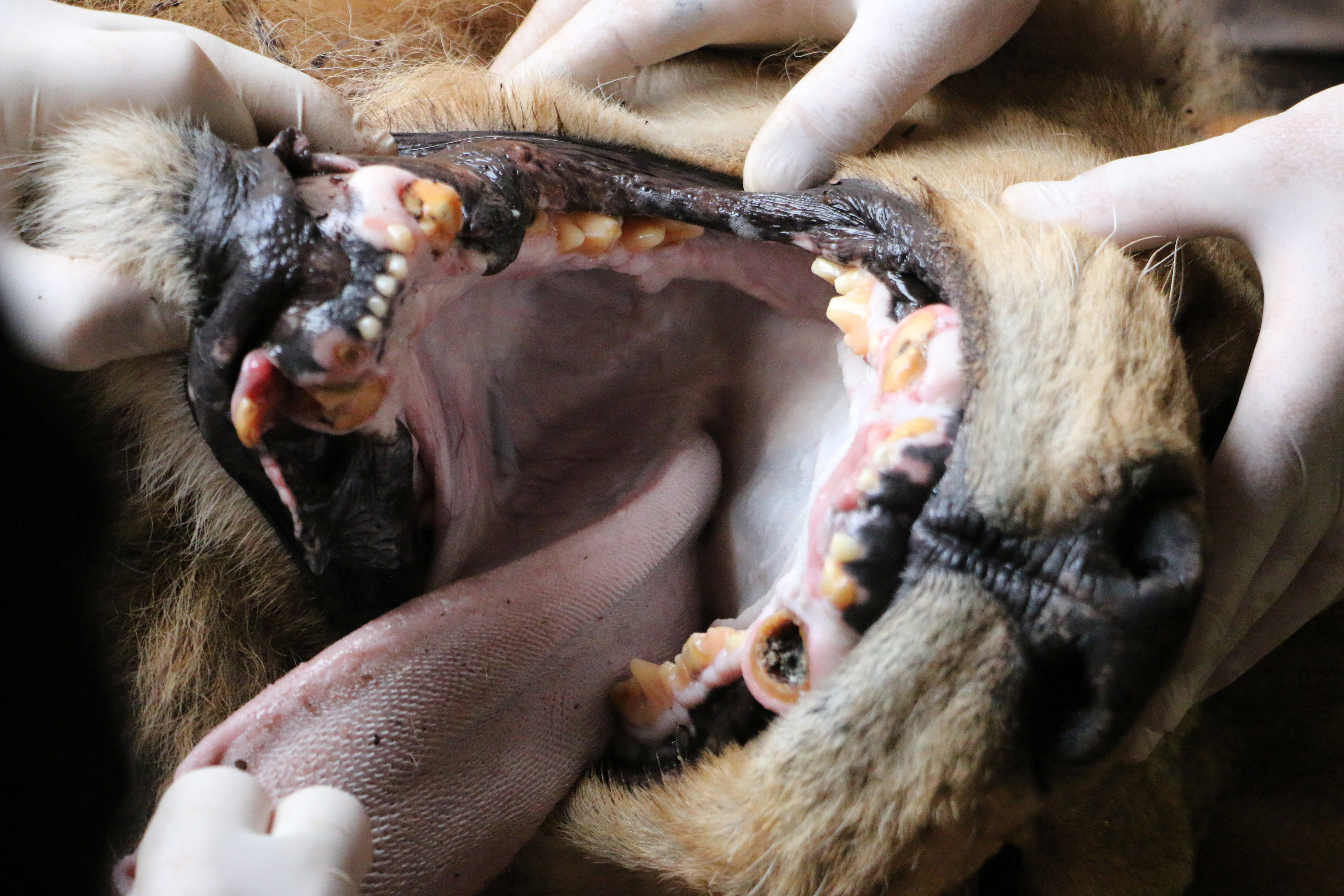 L’état de sa dentition est catastrophique : beaucoup de dents sont très abîmées et il ne possède aucun croc. Une énorme et profonde carie a totalement rongé la racine d’un croc, où de la nourriture putréfiée s’est accumulée. Bien que la cavité ai été nettoyée, l’intervention d’un spécialiste sera nécessaire afin de soigner cette plaie qui doit grandement le faire souffrir.